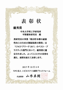 中央大学平野研究室を中核として(株)十川ゴム、(株)エヌ・ワイ・ケイの異業種が手を組んで産学連携研究グループを構成し、研究・開発に取り組んできた、”既存貯水槽の耐震性向上のための制振装置の開発” が、CNCPアワード2017 ベスト・プラクティス部門で優秀賞を受賞しました。